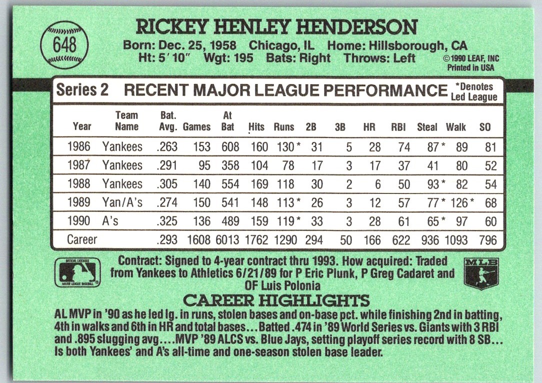 | 1991 Donruss RICKEY HENDERSON #648 Oakland Athletics A's HOF | ||||||||||||||||||