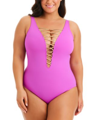Bleu by Rod Beattie delivers drama at the beach with this plus size one-piece swimsuit designed with a plunging V-neck accented by lace-up detail.
