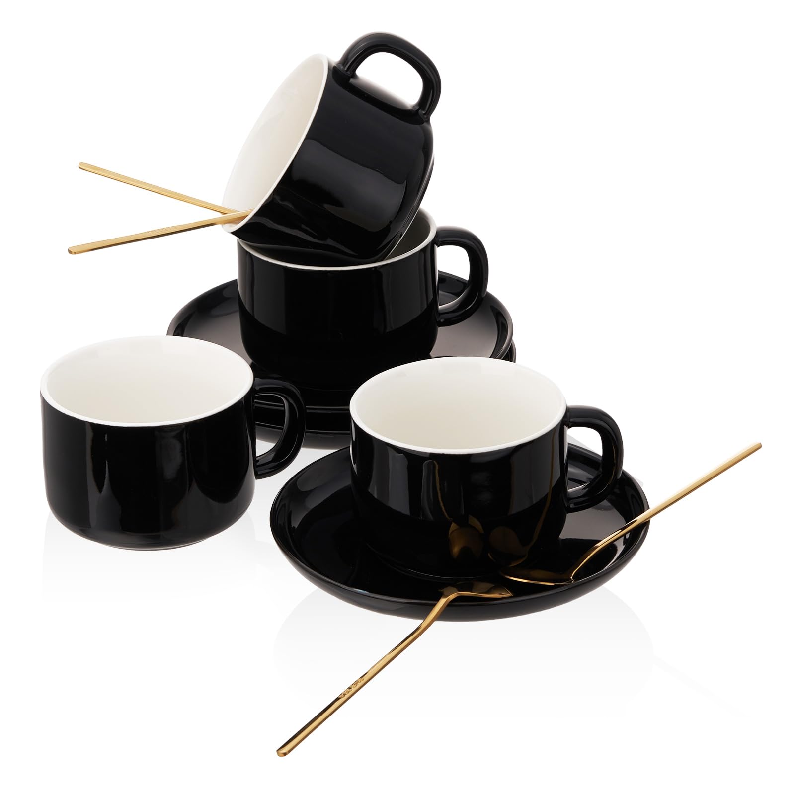 Enjoy your life, Enjoy your tea or coffee time with our tea cups and saucers! Enjoy an elegant afternoon! Using tea cups and saucers, just drinking the delicious coffee in a high-end coffee shop. Tea cup and saucer set are decorated with glossy gold trim and a delicate dessert, perfect choice for your afternoon tea time.With Tea Cup and Saucer Set, it can improve quality of life of individuals, and you can enjoy the natural atmosphere of relaxed elegance. Housewarming Gift What a great and thoughtful gift for friends' birthday, Christmas, Thanksgiving Day and other memorable days. They will be so impressed by your sincere wishes and kind thoughts. Easy to wash. It can be cleaned easily under running water. Not contain lead and other harmful to the human body. Specifications: Material: High Grade Porcelain Colour: Black Cup diameter:3.2 inch Cup high: 2.56 inch Saucers diameter: 6 inch Spoons diameter: 5 inch Package Included: 4 * espresso cups 4 * espresso saucers 4 * spoons Note: Due to the hand measurement, there have size error about 1 -2mm. If you have any questions about the product, please feel free to contact us, we will help you solve it as soon as possible. Thanks!