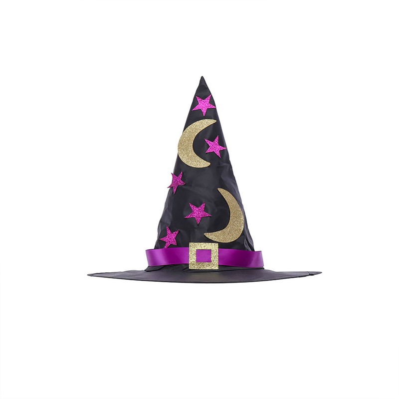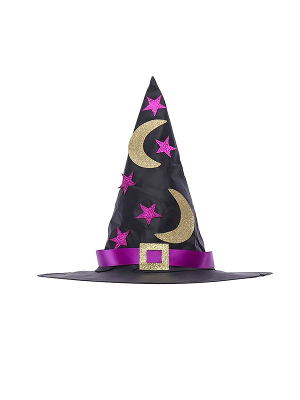 Pointed hat is decorated with ribbon and buckle, wide and wave style brim.