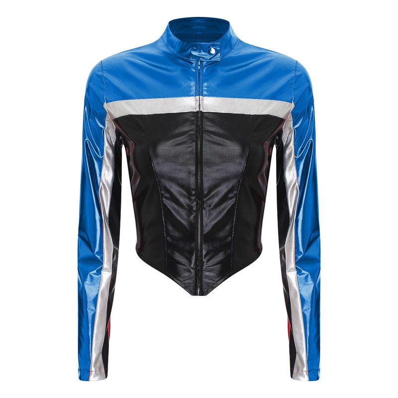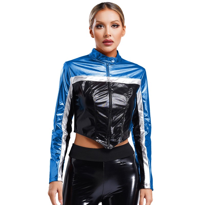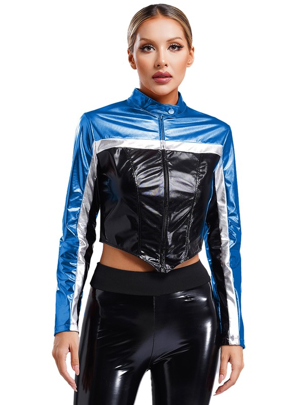 Metallic shiny surface and chic contrast design creates a professional racing driver look. Crop jacket fully shows off your curved figure.