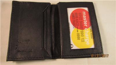 FRONT LEFT Folds to the left and reveals 2 slots for credit cards and under is marked