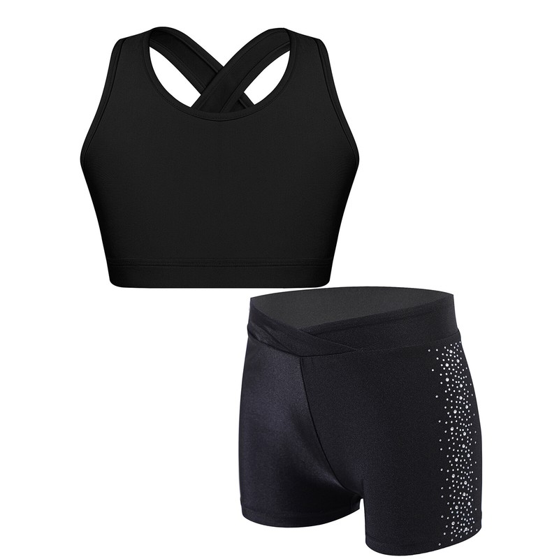 Girl’s V-front waistband shorts with sparkly rhinestones on both sides to brighten up any performance.