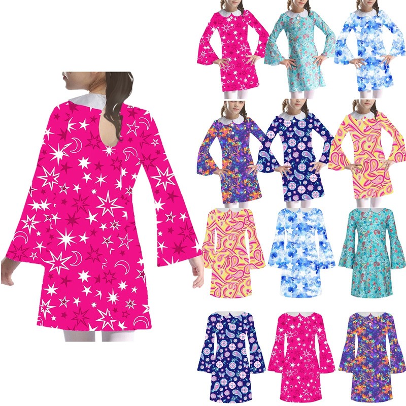 Kids Girls 70s Disco Dance Dress Long Sleeve Print A-line Dress Retro Costume for Halloween Party.