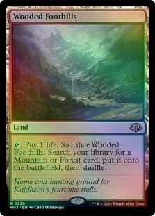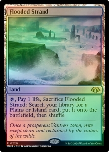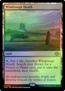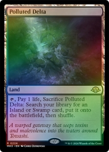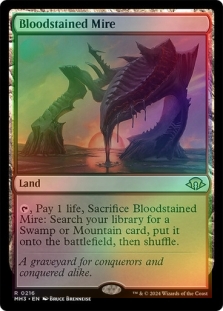 , Pay 1 life, Sacrifice Bloodstained Mire: Search your library for a Swamp or Mountain card, put it onto the battlefield, then shuffle.