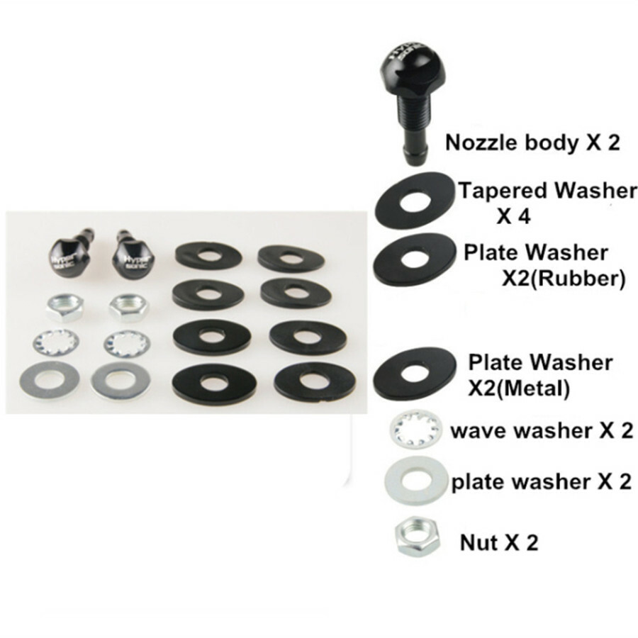 Installation:1.Carefully remove existing washer jets(it may be helpful to warm the pipe). 2.Fit washer jsets as shown in daigram. 3.Lightly tighten nuts and refit pipes. 4.Check spray direction and turm to optimum position. 5.If tool low remove jest and re-assemble using tapered washers to raise the angle as shown in diagram. 6.When spray pattern conrrect secure nuts taking care not to over tighten.