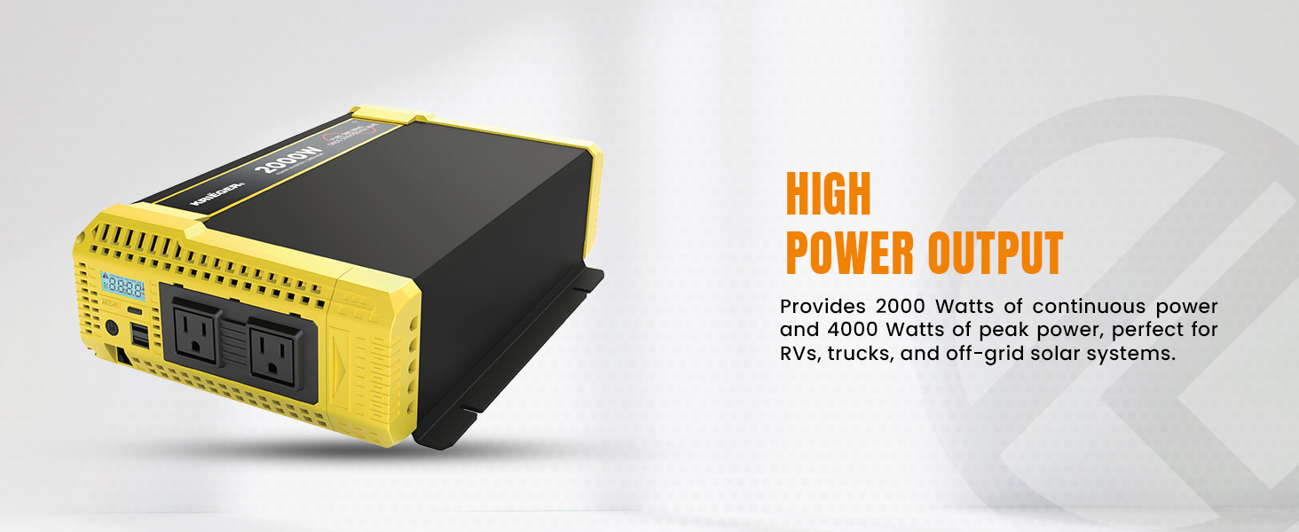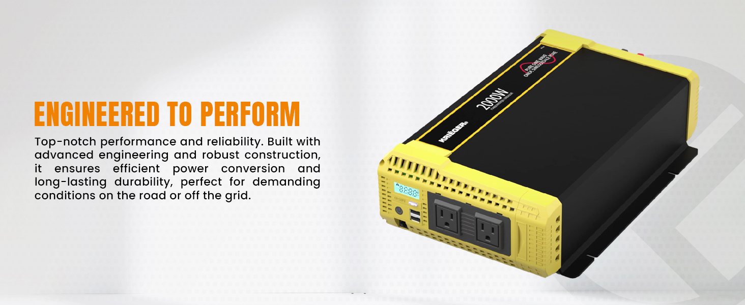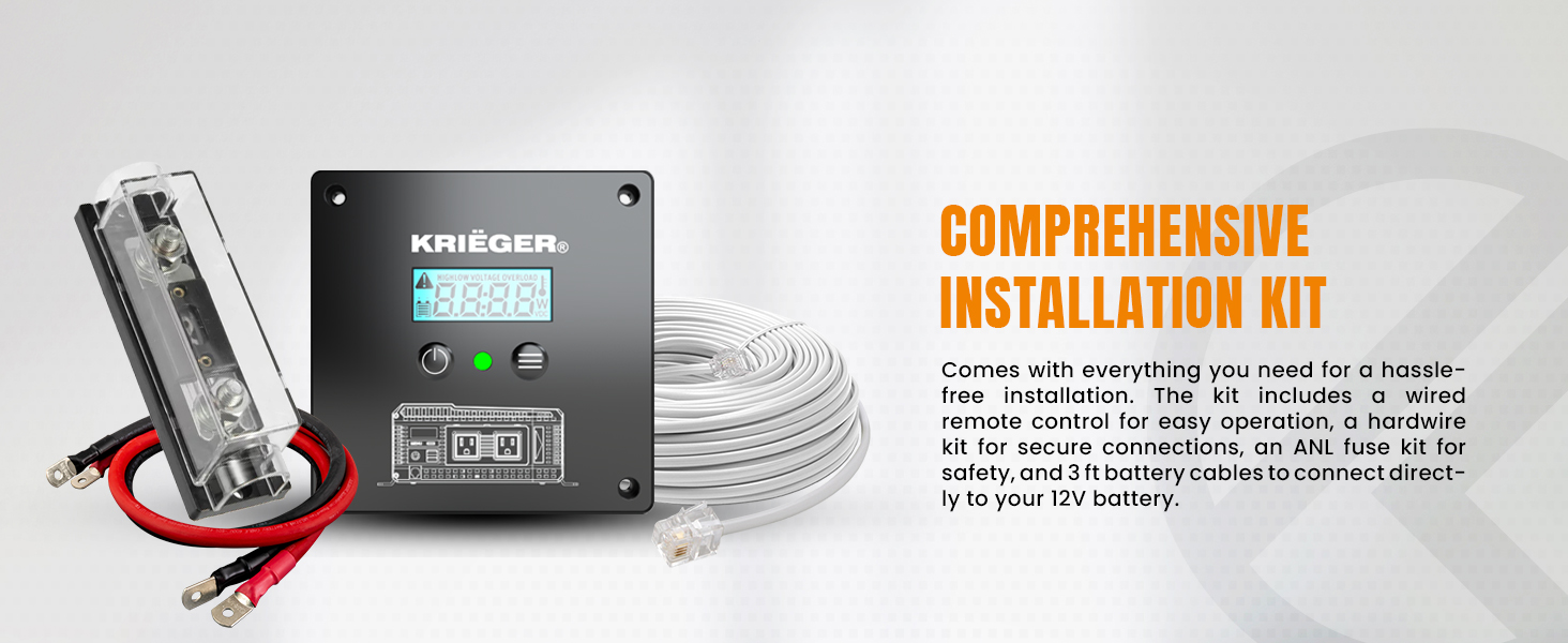 The Krieger KP2000, 2000 watt inverter powers small appliances, power tools and more. Unmatched performance, our inverters are designed and built to handle inductive loads; watt per watt we outperform our competitors. Product Specification: 2000 watt of continuous capacity and 4000W Peak. This product has been tested, validated and approved by ETL under UL STD 458 for both its safety and performance. Input Voltage: 12V DC, Output voltage: 110V~120V. Dual USB with QC 3.0A each. LCD Display: Input Voltage / Output Wattage / Battery Level. This inverter has all the protections that you will need, Overload, Temperature, short circuit and all of these protections are displayed on the front LCD. Our version of an all-inclusive 1 x 2000W Power Inverter 1 x set of 3 FT cables!
