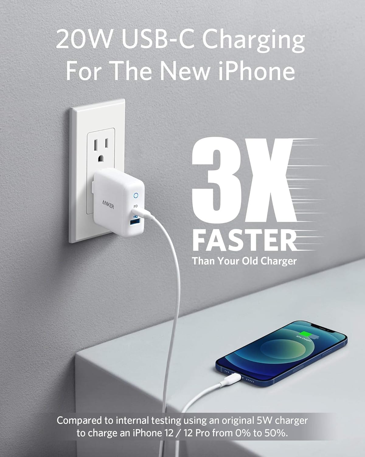 Charge two devices at once! Use the 20 W USB-C port to charge iPhone (USB cable not included; older models require Lightning adapter), iPad, Galaxy, Pixel, and other higher-power devices up to three times faster than with an original 5 W charger. The 12 W USB-A port is for lower-power devices.