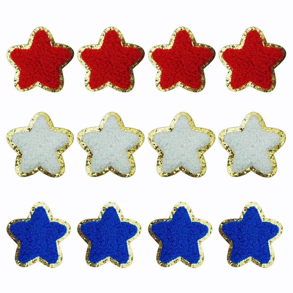 12 PCS Star Patches Chenille Patches Gold Edge Patriotic Iron On Patch Red White Blue Star Appliques for 4th of July Cloth Decor by Patriotic Iron On Product Description: You can use these ironing on or sewing on patches to cover holes or decorate clothing. Iron on patches are perfect for decorating clothes, shirt, hat, backpacks, jackets, and so on. The red, blue, and white star patches are in color to the American flag, bringing you a strong Independence Day atmosphere and adding a sense of layering to your decorations. Ironing them on your clothes can express your love for the country, Create a strong Independence Day holiday atmosphere. Stars Patch USAGE DESCRIPTION: 1. Keep the back of patch is dry before you use it, Please note that the film on the back is glue, please do not tear it off. 2. Sew to fix in place would be before preheat ironing, Preheat iron to cloth setting. 3. Place the applique on the surface of the cloth, cover the applique with a cloth. back and forth ironing several, generally ironing 10-20 seconds or so can be. 4. Turn garment inside-out and, with your heat iron, apply pressure for 10-20 seconds to the back of where your applique has been tacked (The specific ironing time can be determined according to the fit). 5. There is no iron at home, you can also directly with the same color line to sew the patch on the clothes. Star Patches Contents: 12 PCS X Star Iron On Patch. (Including 4 red star, 4 blue star, 4 white star.) Patriotic Patch Size: 1.96 inch/5 cm Star Appliques Specification: Color: Red White Blue Gold Material: Chenille Shape: Star KINDLY REMINDER: Color may vary slightly due to the color setting of each individual monitor. Star patches can't be applied to raincoats.