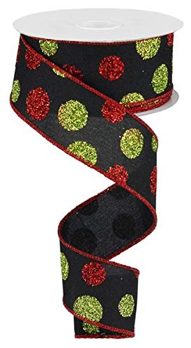 A ten yard roll of 1.5" wide black, red, and green glitter multi size polka dots wired edge ribbon. 10 yards or 30 feet per roll.