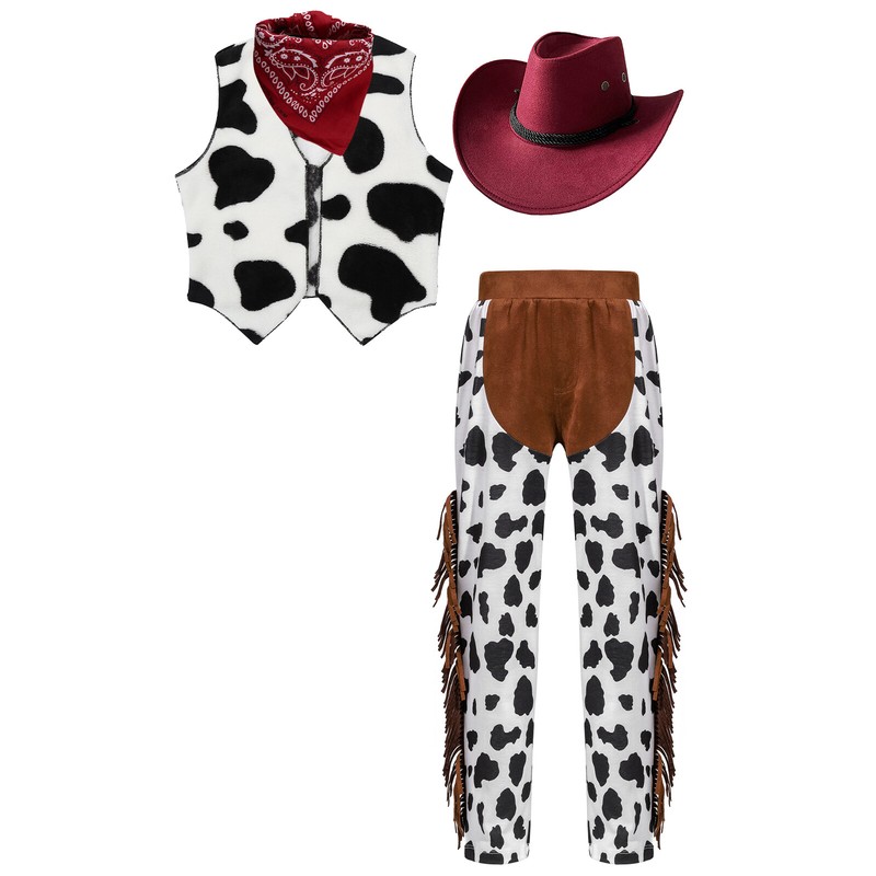 Cowboy cowgirl costume set includes a vest, a pants, a bandanna and a felt hat.