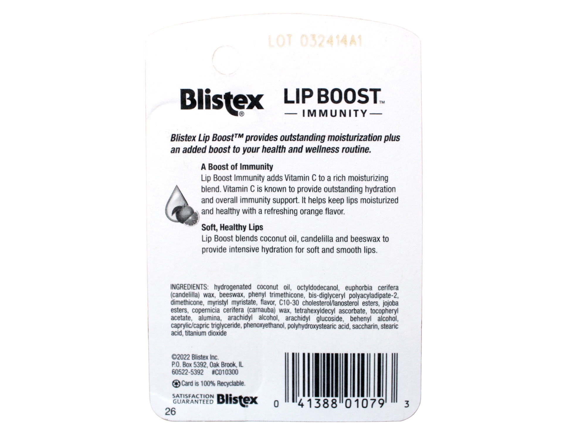 Blistex® Lip Boost™ Immunity provides outstanding moisturization plus an added boost to your health and wellness routine. Lip Boost blends coconut oil, candelilla and beeswax to provide intensive hydration for soft, healthy lips. Lip Boost Immunity adds Vitamin C to this rich moisturizing blend. Vitamin C is known to provide outstanding hydration and overall immunity support. It helps keep lips moisturized and healthy This balm has a refreshing orange flavor. The Lip Boost range includes a total of three hydrating formulas that provide a different boost to your lip care. Each one contains an exceptional moisturizing blend with a healthy added benefit. Also try Blistex Lip Boost Wellness with elderberry extract and Blistex Lip Boost Health with turmeric extract. MOISTURIZING BLEND: Softens and hydrates lips with coconut oil, candelilla and beeswax VITAMIN C: Known to provide exceptional moisturization and overall immunity support ANTI-OXIDANT: Helps promote lasting lip health FLAVOR: Has a refreshing orange flavor