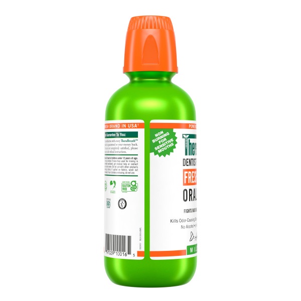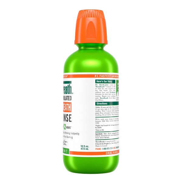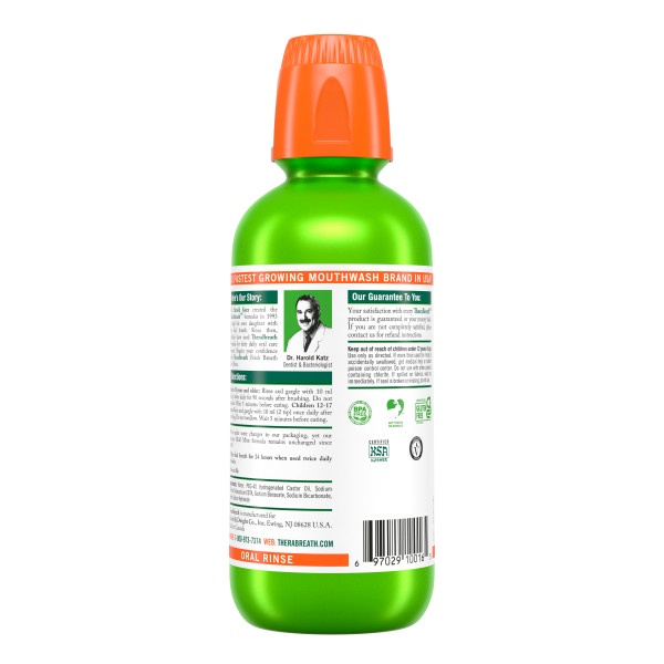 Bad breath is nothing to be ashamed of...everyone gets it! ADA accepted TheraBreath Fresh Breath Mouthwash has been fighting bad breath for over 25 years. When used as directed, it's clinically shown to fight bad breath for 24 hours when used every 12 hours after brushing and flossing. This alcohol-free mouthwash doesn't burn or irritate, and the oxygenating compound that fights bad breath starts working instantly. TheraBreath Fresh Breath Mouthwash has no artificial dyes and is certified kosher, vegan, and gluten-free. We’re so confident in the effectiveness of TheraBreath Oral Rinses that we back them up with our 100% guarantee. If you haven’t seen improvement in your breath, contact us within 30 days of purchase for a full refund. TheraBreath: It's a better mouthwash, satisfaction 100% guaranteed! Bullet Feature 1* FIGHTS BAD BREATH: TheraBreath Fresh Breath Mouthwash fights bad breath for 24 hours when used every 12 hours after brushing and flossing Bullet Feature 2* DENTIST FORMULATED: Dr. Harold Katz created the TheraBreath formulas in 1993 to help his own daughter with her bad breath because nothing else worked Bullet Feature 3* ADA ACCEPTED: Our alcohol-free, non-burning formula is powered by oxygen, and is ADA accepted to help reduce bad breath Bullet Feature 4* RESTORE CONFIDENCE: TheraBreath believes you should define success any way you please. We exist to motivate you to go get it! Bullet Feature 5* IT'S A BETTER MOUTHWASH: Try the #1 fastest growing mouthwash brand in the USA (data on file)