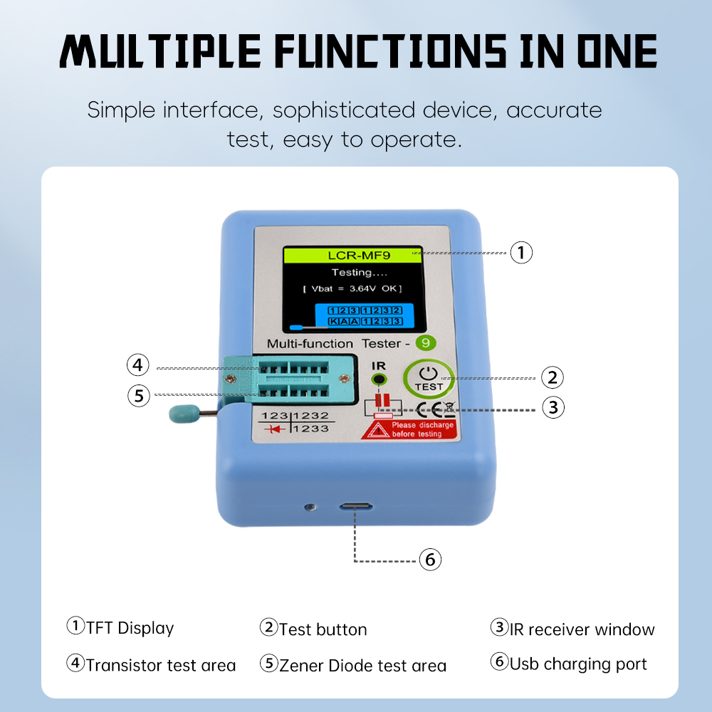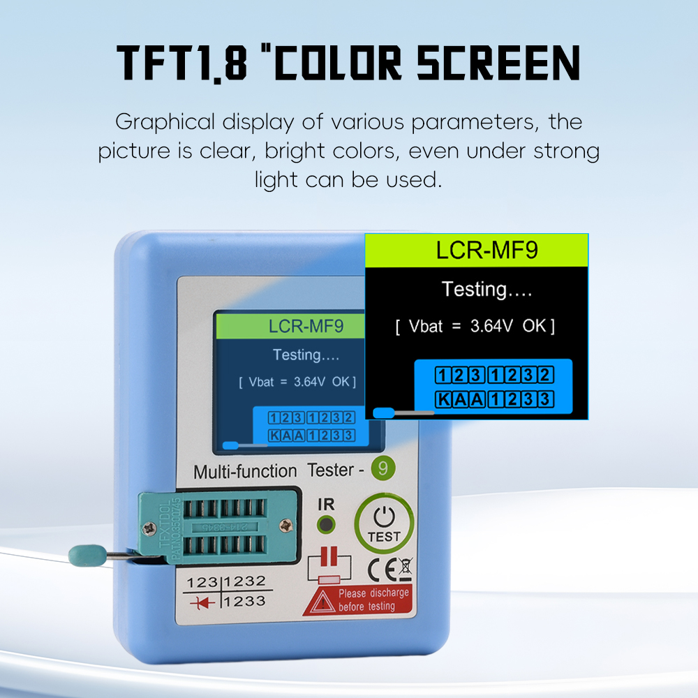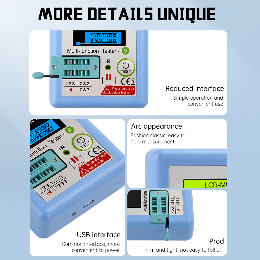 -Automatically detects components such as NPN and PNP transistors, N-channel and P-channel MOSFETs, IGBT diodes (including double diodes), thyristors, transistors, resistors and capacitors.