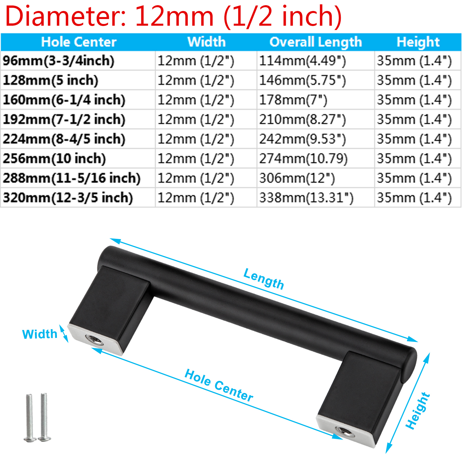 | 288mm(11-5/16 inch) | 12mm (1/2") | 306mm(12") | 35mm (1.4") |