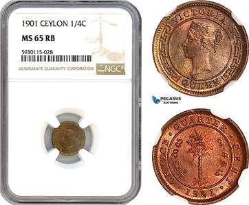 AJ686, Ceylon, Victoria, 1/4 Cent 1901, Calcutta Mint, NGC MS65RB