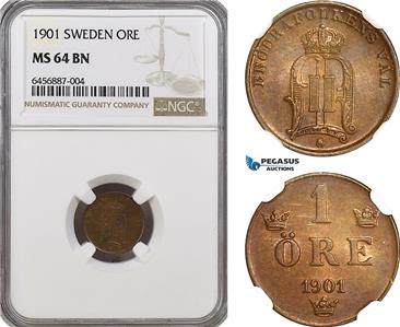 AH148, Sweden, Oscar II, 1 Öre 1901, Stockholm Mint, NGC MS64BN