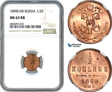 AJ341, Russia, Nicholas II, 1/2 Kopek 1898 СПБ, St. Petersburg Mint, NGC MS63RB