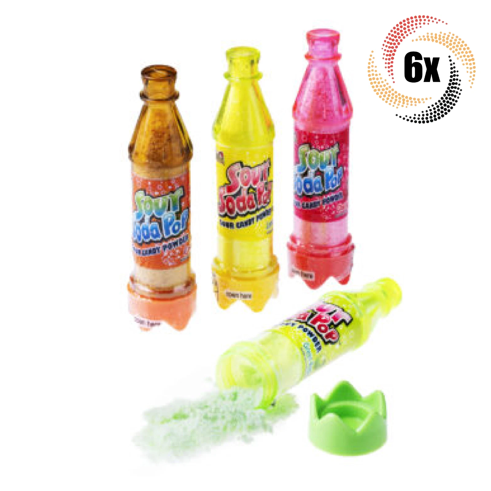 Sour soda pop candy powder in assorted flavors: Cola, green apple, cherry, and lemon.