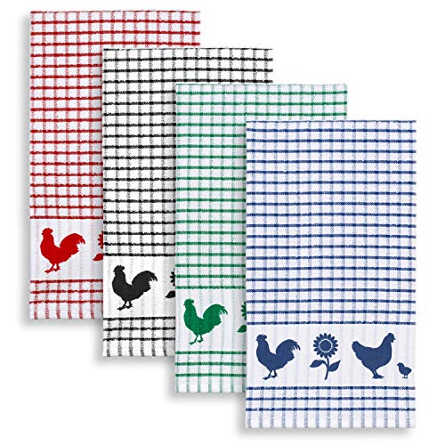 Set of four charming windowpane check terrycloth towels with chickens and sunflowers on the border. These high quality absorbent towels are great for drying dishes and keeping workspaces clean. Towels measure 18 by 28 inches. 80% cotton / 20% polyester. Made in India. Perfect for the crazy chicken lady.