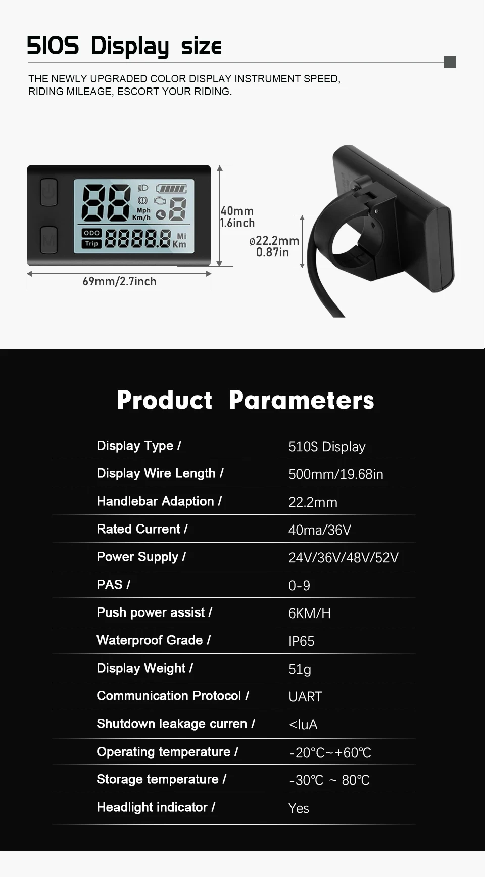 Bafang 510S Display LCD Screen with 5 Pin Female Plug Waterproof Connector Use for BBS01 BBS02 BBSHD Motor Conversion Kit