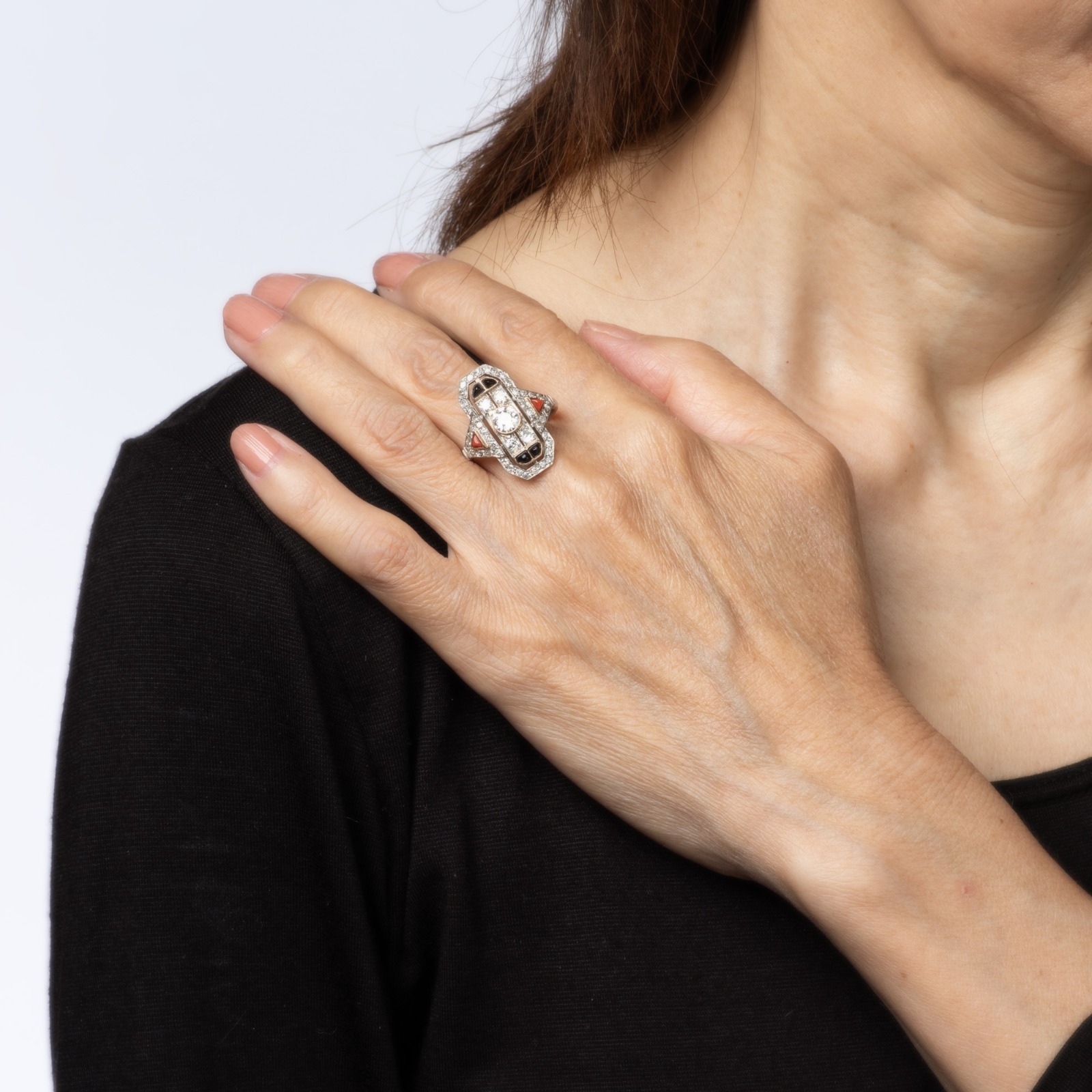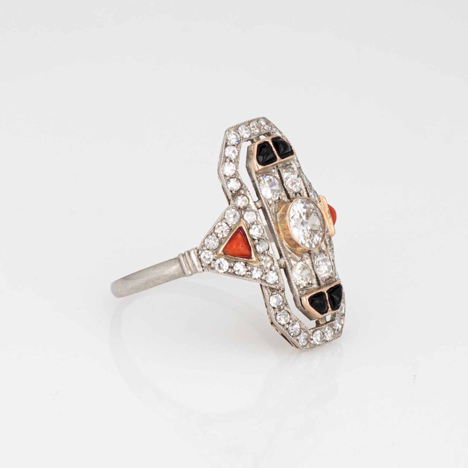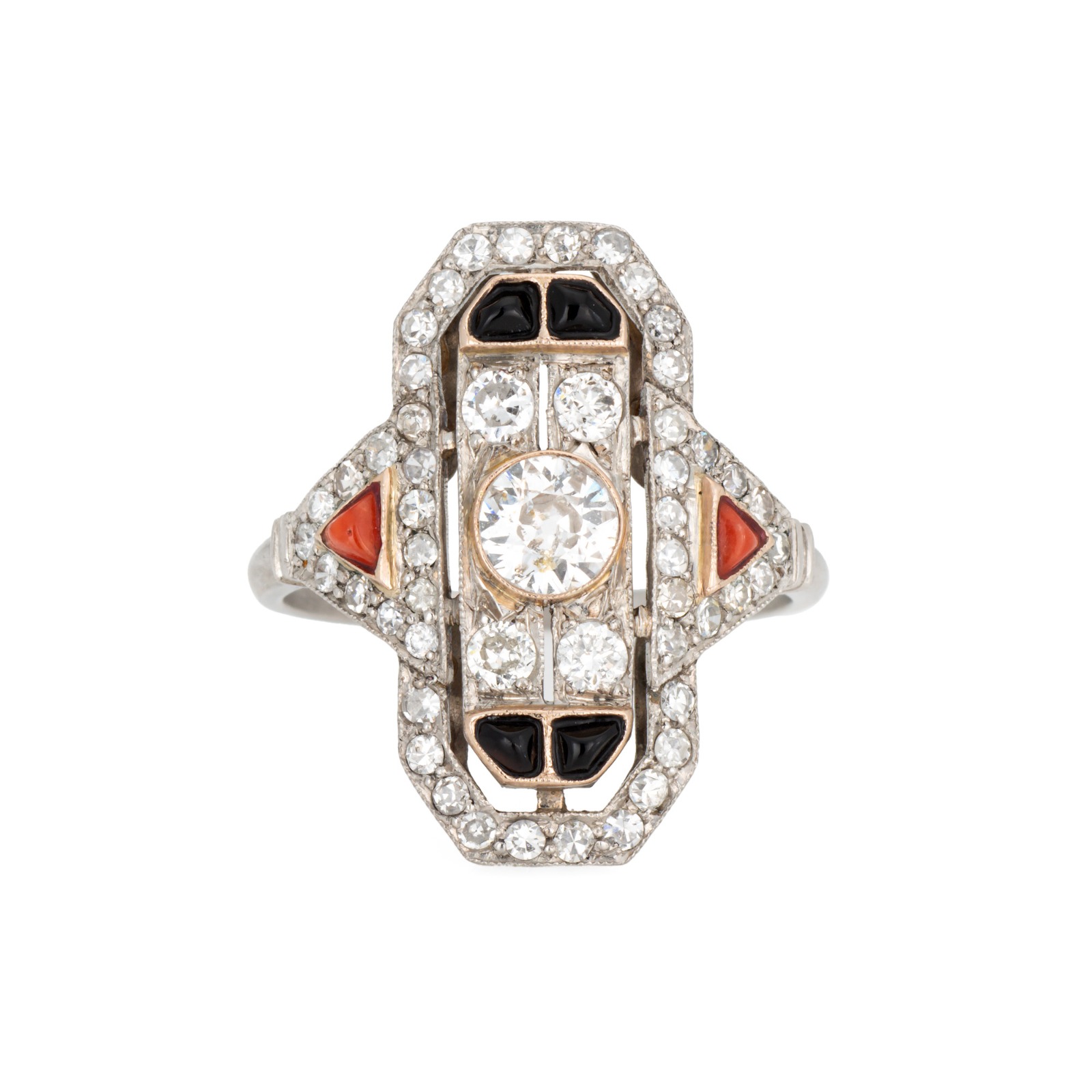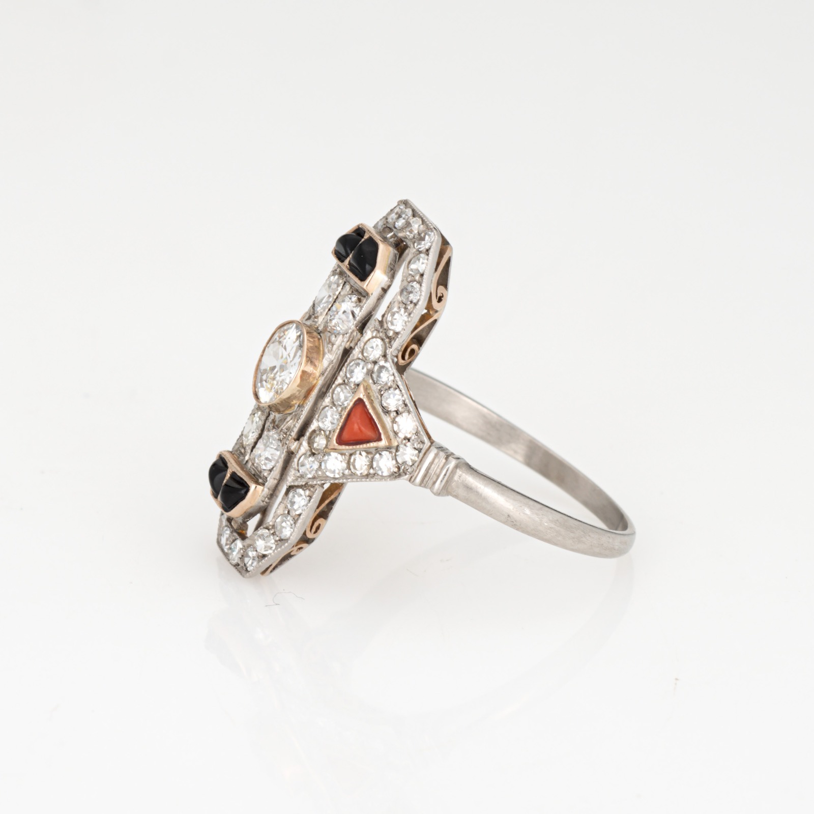 Stylish vintage Art Deco era diamond, coral & onyx ring crafted in 900 platinum (circa 1920s).