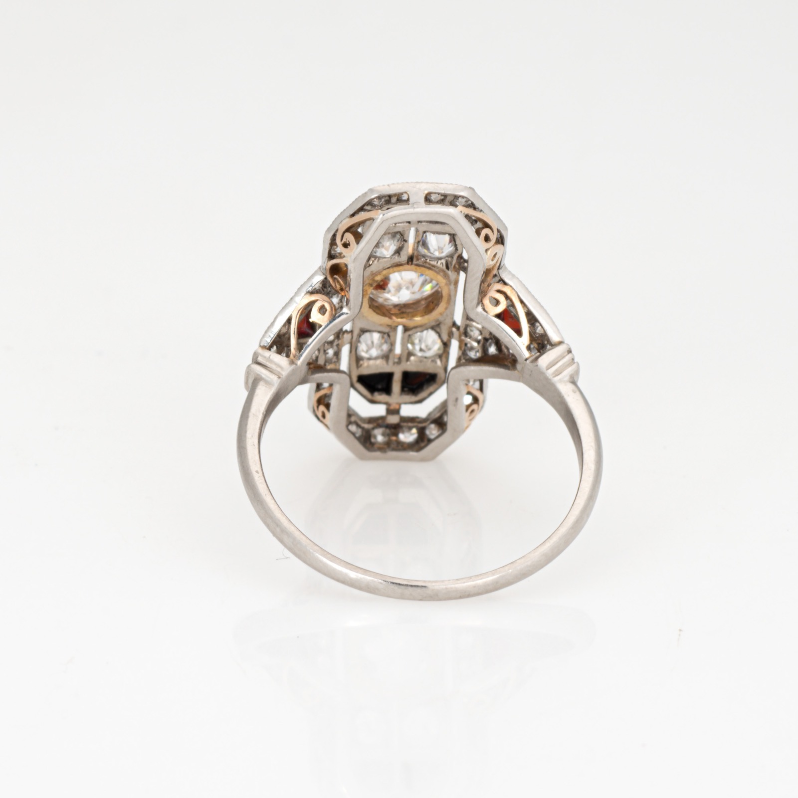 This one is for the books! A spectacular Art Deco era dinner ring highlights a bright and lively center set old European cut diamond, with a surround of shimmery diamonds set into a low domed rectangular mount. Natural coral & onyx frames the mount and adds a lively pop of color. The cocktail ring is larger in scale (length is 24.5mm - 0.96 inches) and makes a great statement on the hand. The low rise ring (5mm - 0.19 inches) sits comfortably on the finger. The original Art Deco era ring is a feast for the eyes, with minute details including fine mile grain and hand rendered scrolled metalwork to the underside of the ring.
