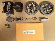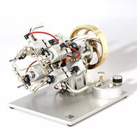 The piezo high voltage ignition system built into the base is propelled by a drive belt from the engine shaft. The ignition, or rather, ignition point is controlled by a central distributor. Gas and rotation speed control is achieved via a valve on the gas tank with pressure gauge. 2 sprockets fasten the tumbling spider. Ball and socket joints connect the tumbling spider and pistons.