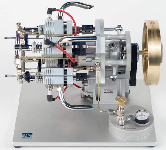 The elegant motion sequence of four cylinders is especially accentuated by the open construction design. The counter-rotating parts – tumbling spider, pistons, crosshead and push rods – present an intriguing mechanical interplay while operating. The engine runs at a pleasantly deep pitch.