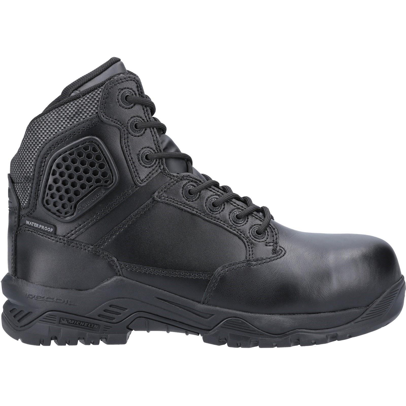 The Magnum Strike Force 6.0 Uniform Safety Boots provide exceptional protection and comfort. These waterproof boots feature a lightweight composite toe cap, anti-penetration plate, and YKK side zip for easy access.�With a durable leather upper and breathable mesh panels, they keep your feet dry. Exogel technology ensures ankle protection, while the padded collar and non-metallic composite shank offer lightweight support.�The M-P.A.C.T Response insole delivers shock absorption, and the MICHELIN outsole provides high traction and slip resistance. Certified to European standard EN ISO 20345:2011 S3 WR CI HI AN HRO SRC, these boots are perfect for women in demanding environments.