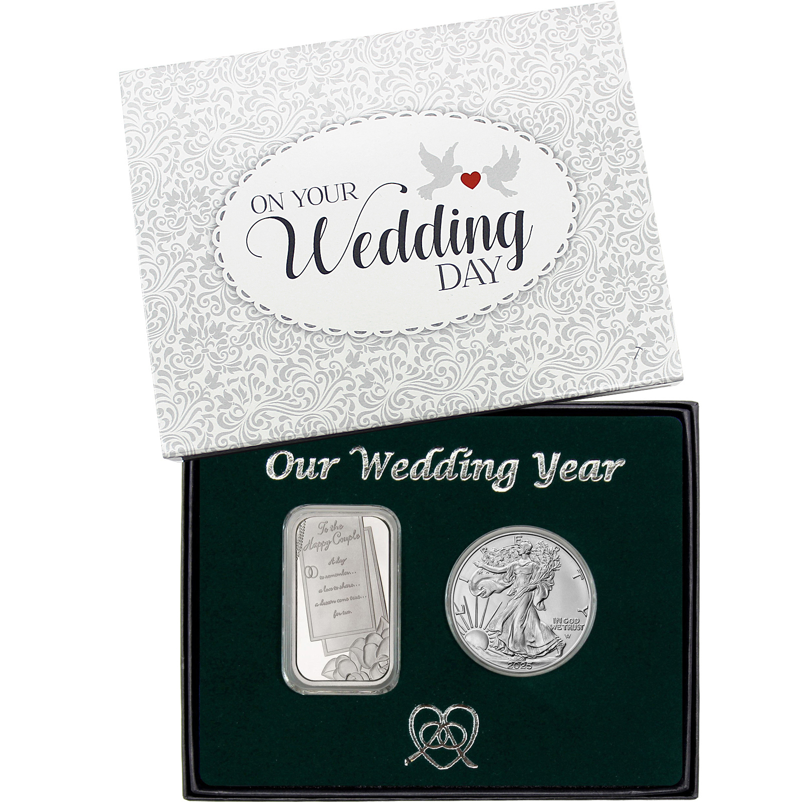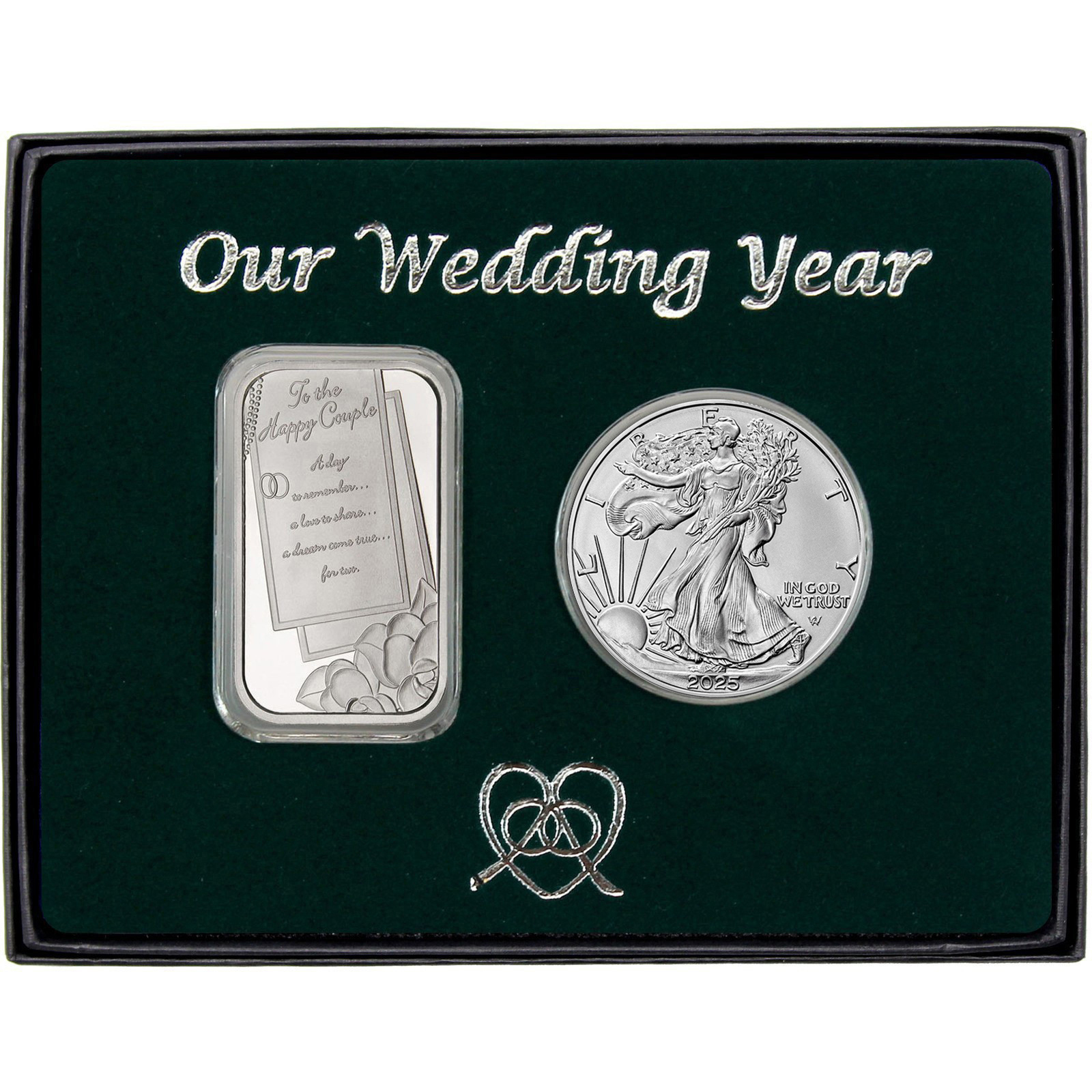 "Our Wedding Year" .999 1 Troy Ounce Silver Wedding Happy Couple Bar and 2026 Dated Silver American Eagle BU 2 Piece Box with Mat Set