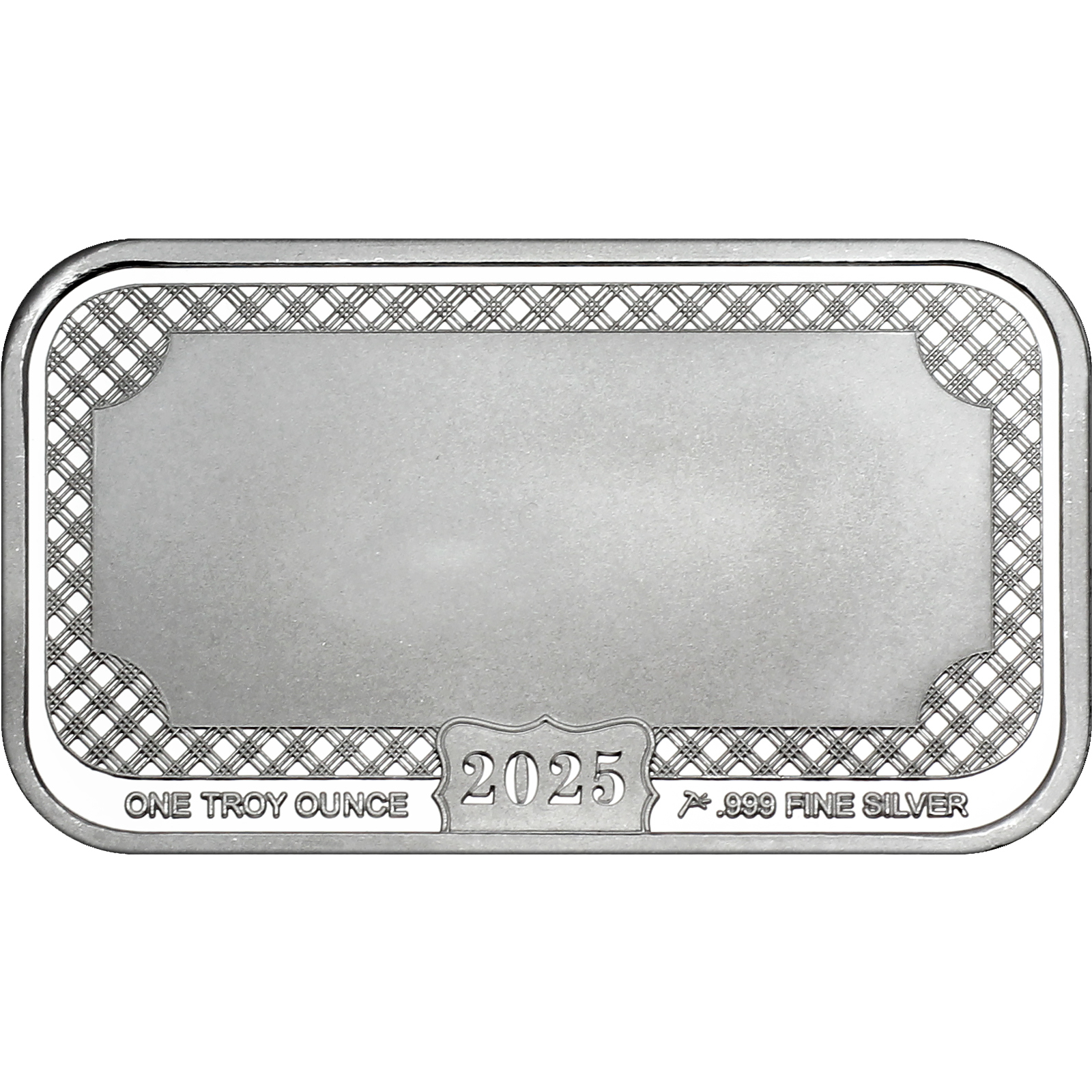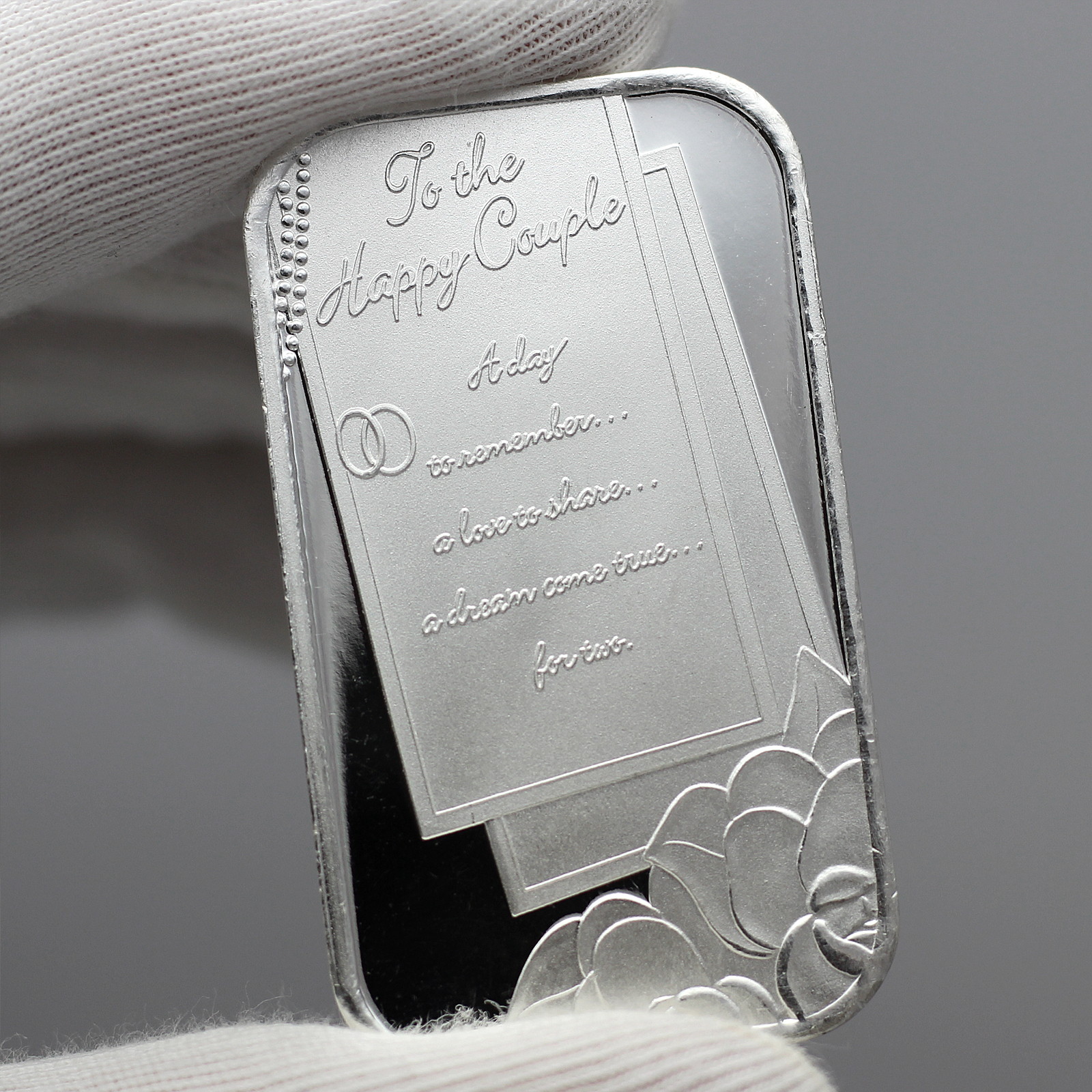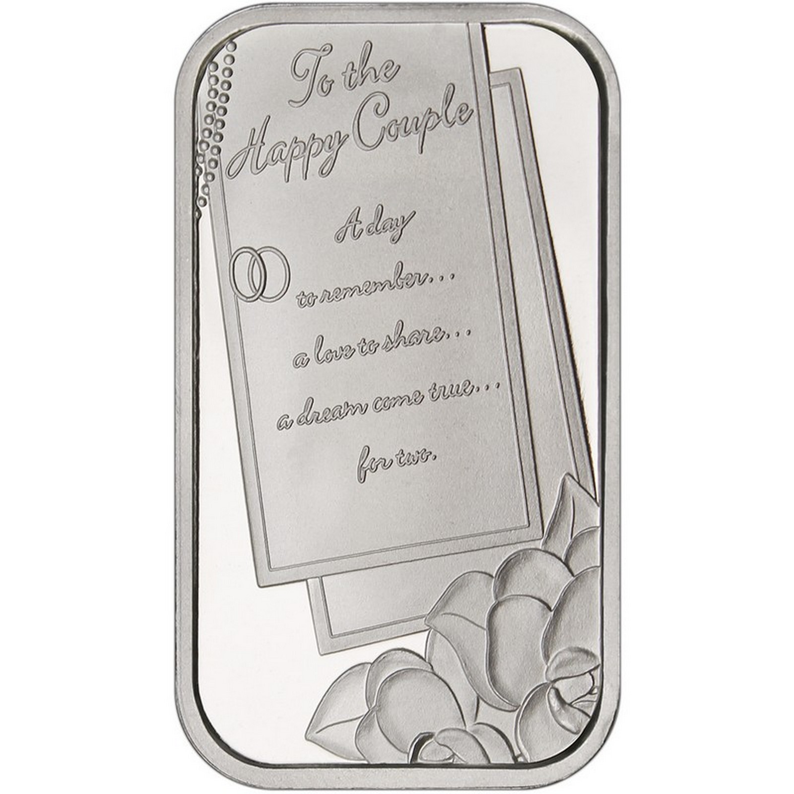 Great for a Wedding Gift, a total of 2 Troy Ounces of .999 Fine Silver. This set includes the SilverTowne Minted 1oz Happy Couple Bar with an engravable back and the current year-dated 2025 American Silver Eagle BU issued from the US Government with a $1 Face Value.