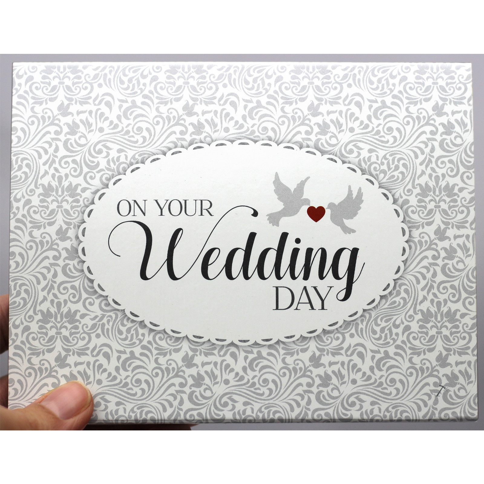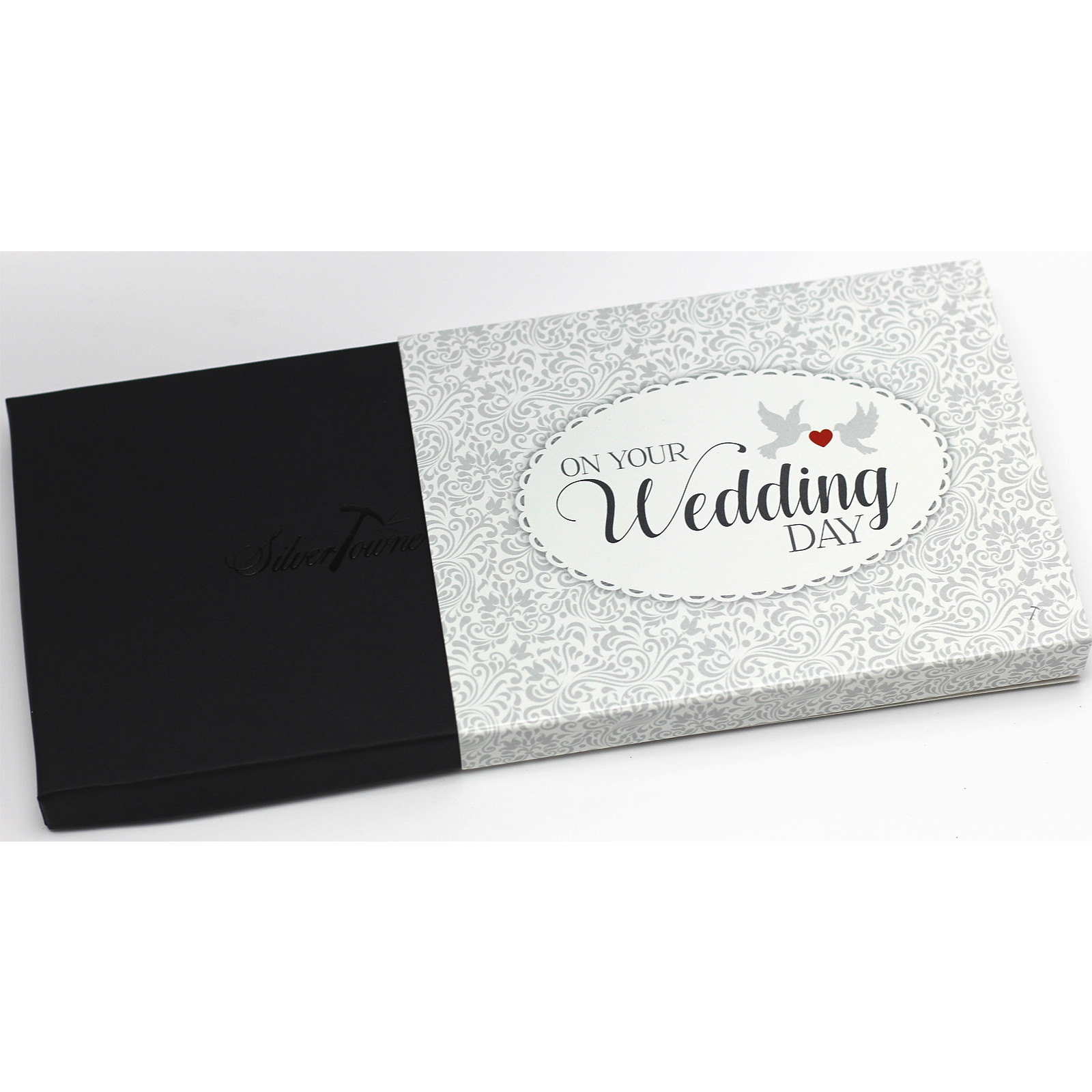 Your wedding gift will arrive in protective plastic capsules inside of our SilverTowne black 2 piece gift box (made in the USA). A velvet 2 hole insert holds your silver pieces snug inside the box. Pairing perfectly with the gift, the package is finished with a SilverTowne original box sleeve in our Wedding design. The sleeve was designed with a blank area on the back for you to write a message or To/From on for gift-giving. No gift wrapping or gift tags needed with this convenient option!