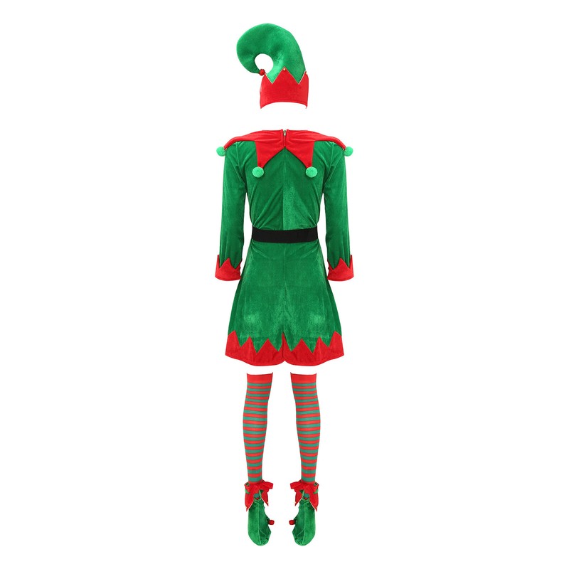 A complete Christmas elf costume set for adult size, includes a hat, a dress, a pair of elf ears, shoes covers and stockings.