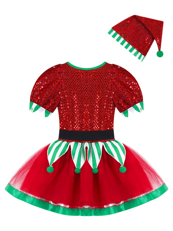 Kids Girls Christmas Elf Cosplay Costume Sequins Pompoms Adorned Mesh Tutu Dress with Hat.