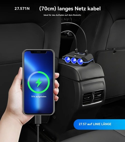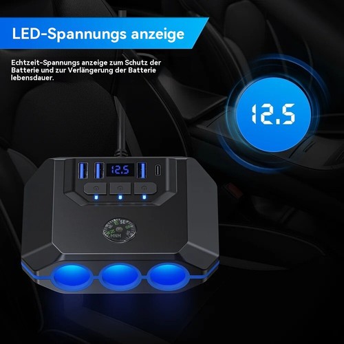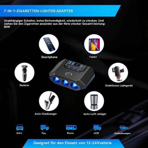 1. 7-in-1-Zigarettenanzünder-Adapter, Zigarettenanzünder-Ladegerät ausgestattet mit 4 USB-Ladeanschlüssen und 3 Zigarettenanzünder-Buchsen mit einer Gesamtleistung von 120W
