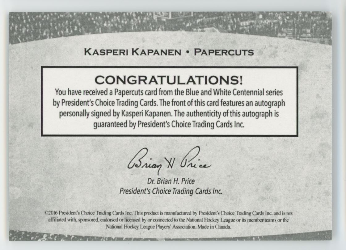 | 2016-17 President's Choice Blue and White Centennial Papercuts Kasperi Kapanen |