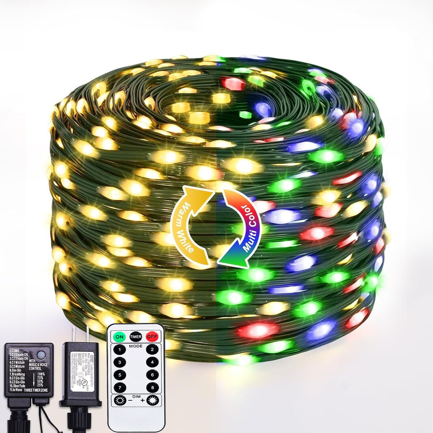 - 8 Light Modes and Memory Munction:Christmas lights has 8 light modes (Combination,In waves,Sequential,Slo-glo,Chasing/flash,Slow fade,Twinkle/flash,Steady on) You can choose your favorite mode according to different occasions and moods to create a unique festive atmosphere. And the christmas lights outdoor has a memory function,which can automatically save the last light mode. Make your Christmas decoration easier