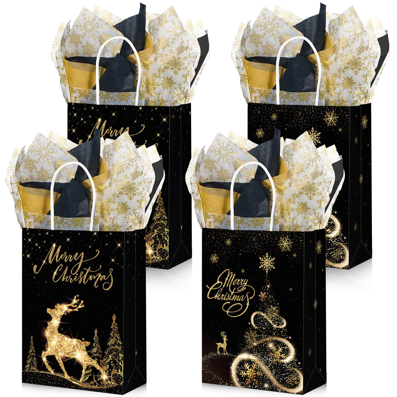 Features: Christmas theme design: These black and gold goody gift bags feature a variety of Christmas elements, Christmas tree, snowflake and elk, use black and gold color, make your gifts add to the Christmas atmosphere. Suitable for many occasions: Our Christmas black and gold gift bags bulk can be applied for wedding, Christmas tree, classroom, school activity or any other winter themed party. The combination of black and gold makes the bags look stylish and more advanced, making your party special. Exquisite design: Different Christmas patterns are printed on the front and back of the metallic gold black gift bags, which is more beautiful and fashionable to use. Specifications: Material: Kraft paper Main color: black, gold Size: approx. 8.7 x 6.3 x 3.2 inches Package includes: 32 x Christmas gift bags 33 x Christmas gift wrapping tissues Notes: Colors may vary slightly due to different screen displays. Manual measurement, please allow for a slight error in the size.