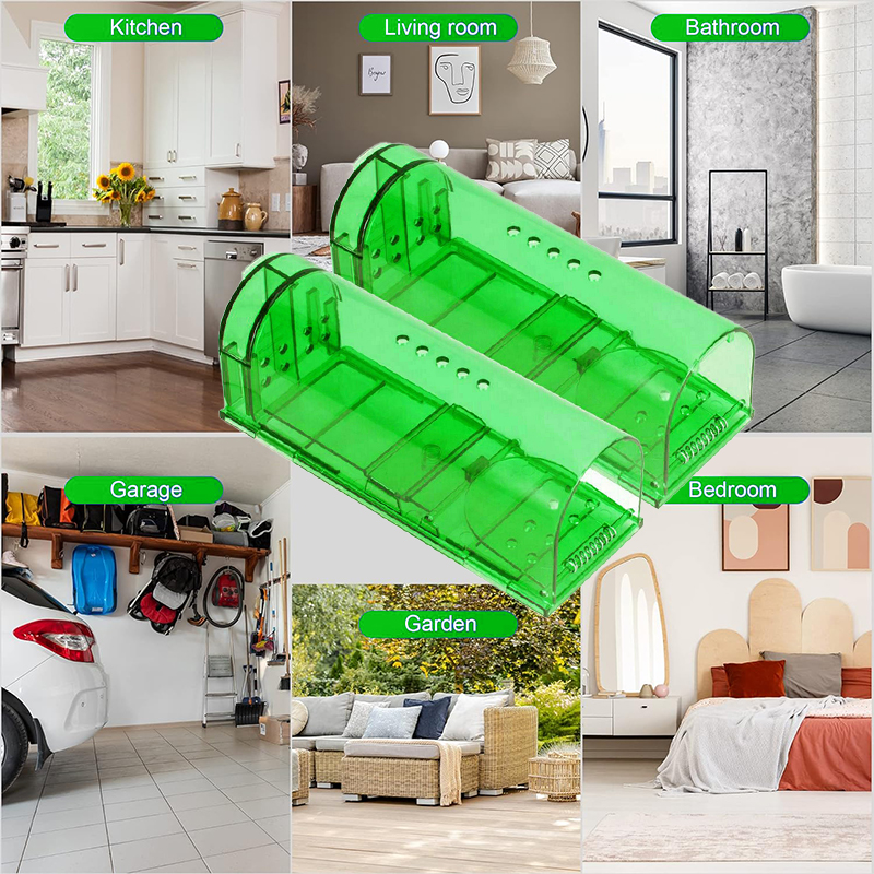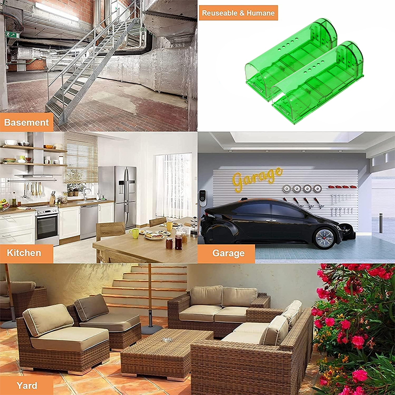 spreading disease and being bitten, so this mouse trap is suitable for indoors and outdoors, like home, kitchen, office, garage, living room and supermarket.