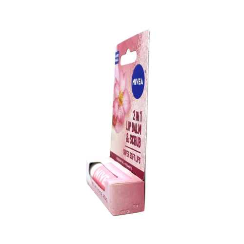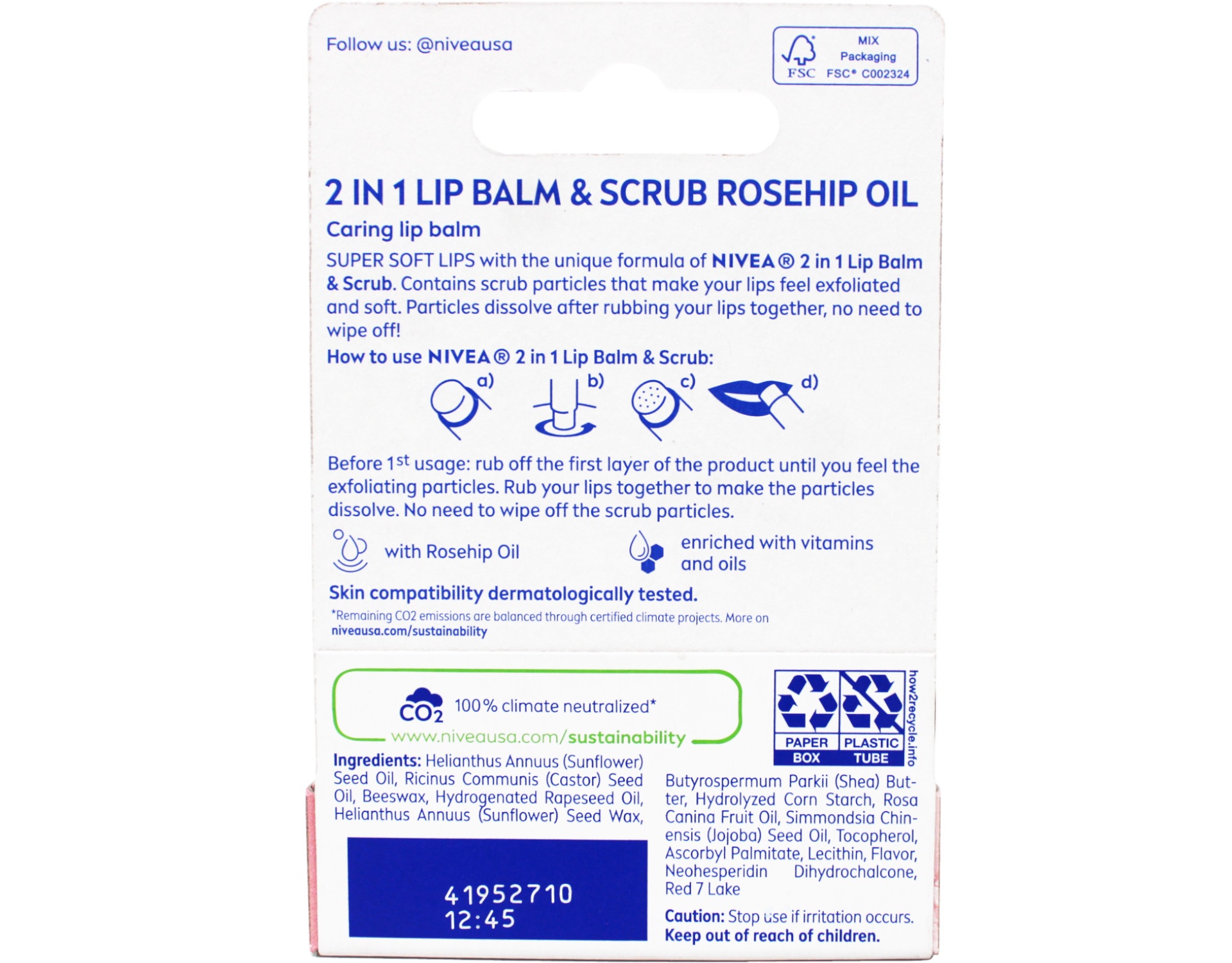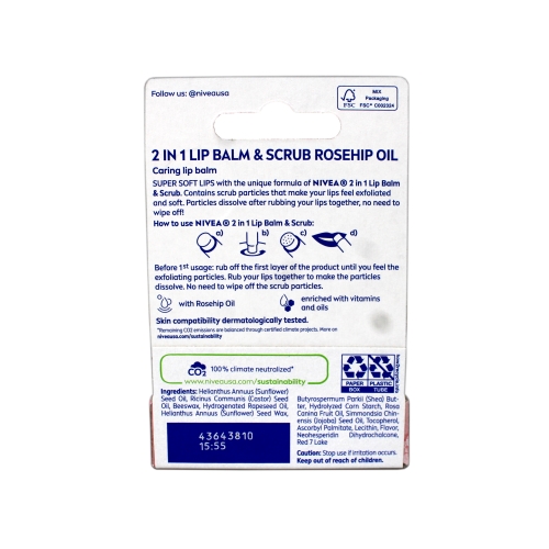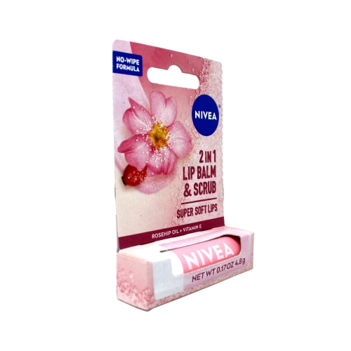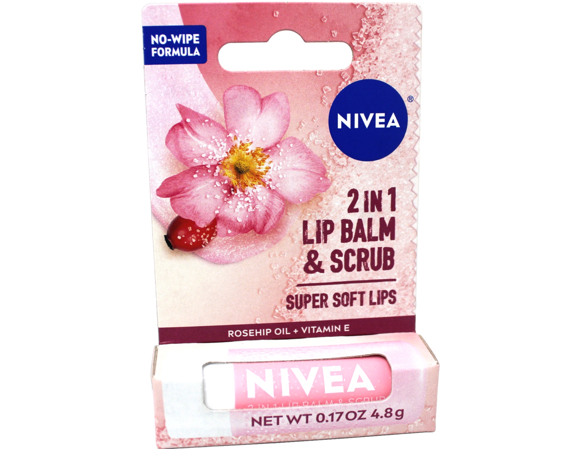 Having Super Soft Lips was never so easy! Care for your lips with the NIVEA 2 in 1 Lip Balm & Scrub. This innovative formula, enriched with Vitamin E and Rosehip Oil, contains plant-based particles that make your lips feel exfoliated, soft and moisturized. This is NIVEA's first scrub in a stick, and an innovation when it comes to daily lip care. This product contains plant-derived grains (from corn starch) as scrub particles, which are very gentle to the skin. Here's the best part: the plant-based particles dissolve after rubbing your lips together. No need to wipe off the scrub particles! Lips are left feeling soft, smooth, and well-cared for since the formula is enriched with Vitamin E. The NIVEA 2 in 1 Lip Balm & Scrub is suitable for dry lips and for daily use. You can even try it as primer before applying lipstick. Feel the care of NIVEA after each application! For more than 100 years, NIVEA has helped people feel good in their own skin. That is why you can trust NIVEA to provide your lips with the ultimate care they deserve. Lip Balm Exfoliates & Nourishes Your Lips Enriched with Vitamin E & Rosehip Oil Non-Wipe Off Application: plant-based particles dissolve after rubbing your lips together Leaves Behind Super Soft Lips Try this lip scrub as primer before applying lipstick!