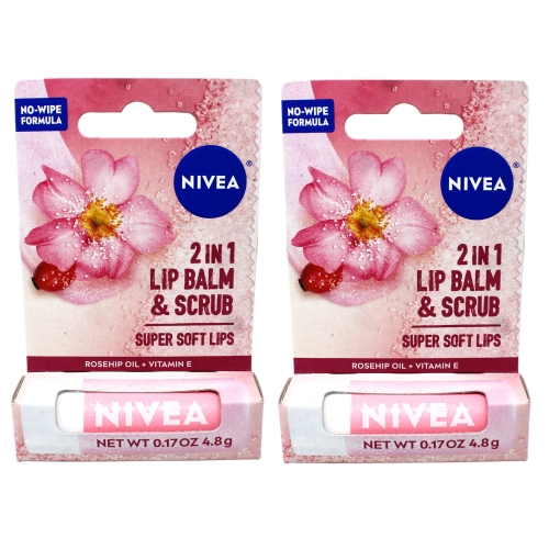 2 Pack Nivea 2in1 Lip Balm & Scrub Soft Lips, Rosehip Oil + Vitamin E, 0.17 oz