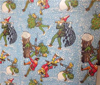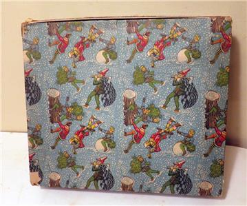 - Pattern: The box is adorned with a repeating winter scene featuring playful elves, gnomes, and woodsmen. They are shown chopping trees, carrying gifts, and playing musical instruments, all set against a light blue background with falling snowflakes.
