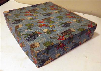 Gift boxes like this were commonly used by upscale department stores during the 1930s-1940s holiday seasons to package gifts for customers. This design likely originates from a high-end retailer, given its detailed and artistic design.