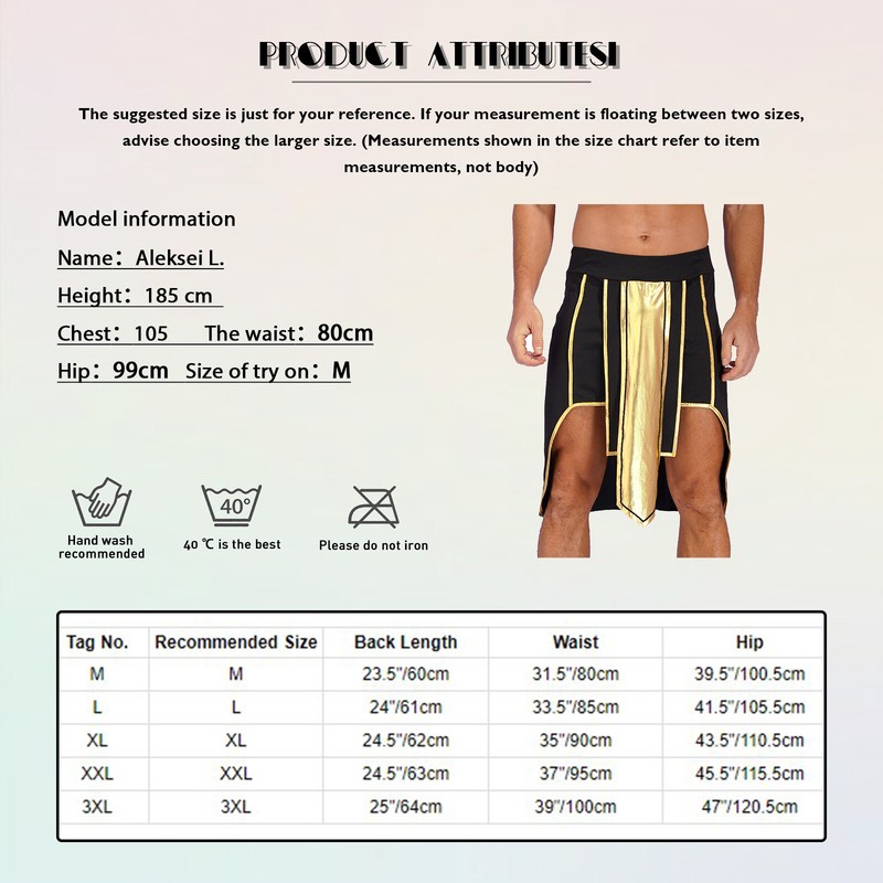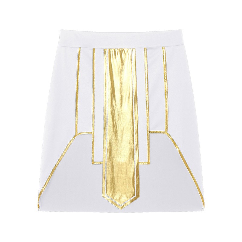 Egyptian pharaoh cosplay skirt for men, contrast color, metallic front drape, asymmetrical hem design.