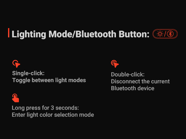 Lighting Modes: Constant Light Mode/Light Off Mode/Auto-Off after 5 Seconds of Inactivity/Spectrum Cycling