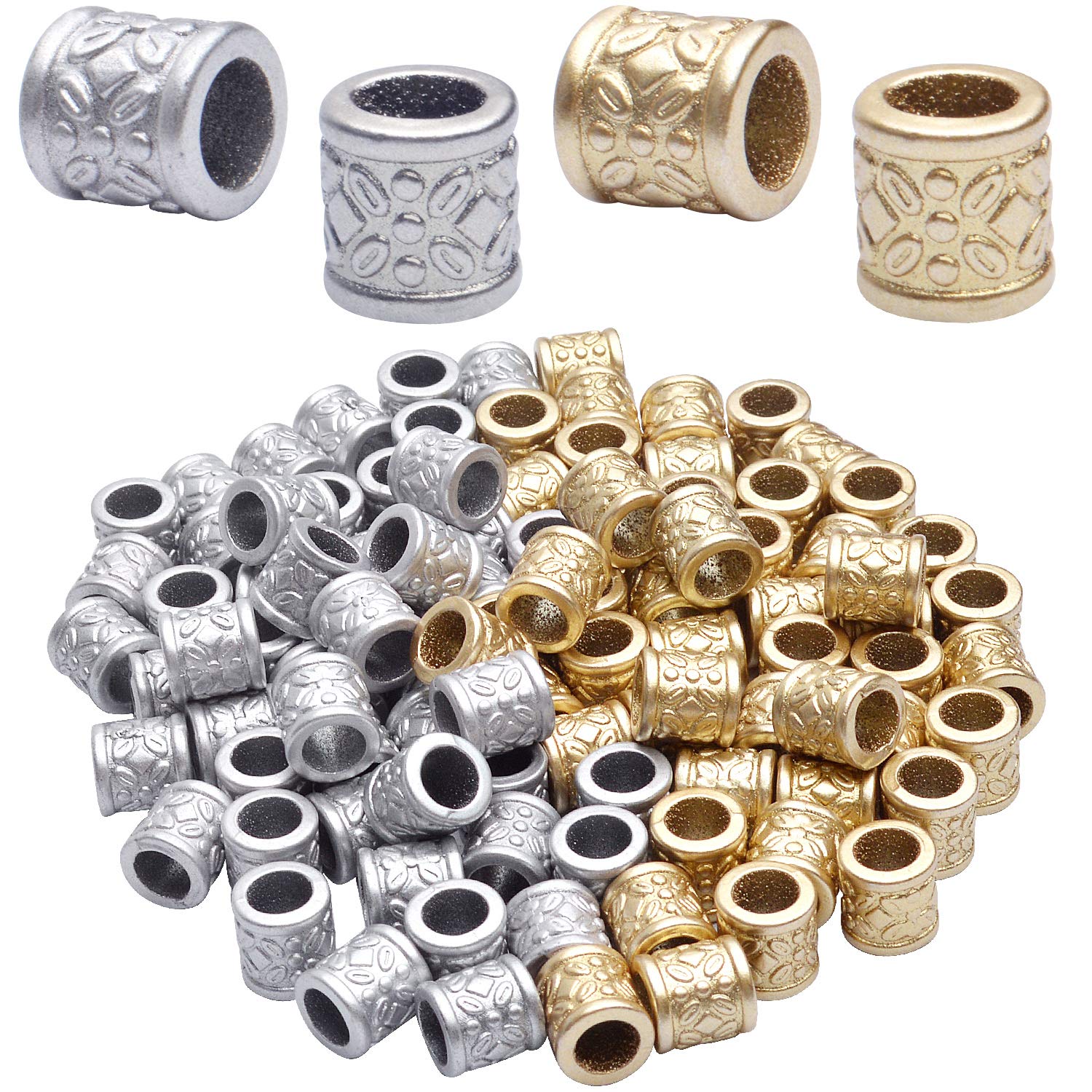 Hair Tube Beads,100pcs Golden and Silver Hair Dreadlock Beads Plastic Braid DIY Beads Large Hole Beads for Men Women Hair Beard Moustache Decoration,9x9x6mm Specification Material: plastic Color: golden,silver Size: 9x9x6mm Quantity: 100pcs Feature Beautiful and fashionable design, the surface of these beads are designed with different flowers. You can create different hairstyles with your family members and friends by these dreadlocks beads. It also a good gift for your lover, family, friend and coworkers. Package Content 50 x Golden Braiding Beads 50 x Silver Braiding Beads