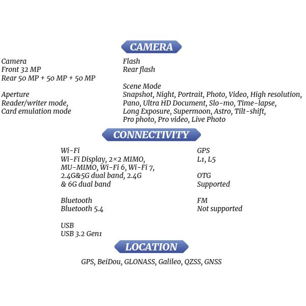MP Cameras: Sony sensors, telephoto, ultra-wide, portrait modes.