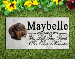 Honor your beloved Dachshund with a personalized memorial stone handcrafted from solid marble β custom printed with their name and years. A beautiful, lasting tribute for garden, home, or graveside.