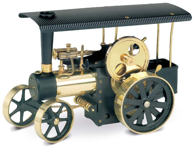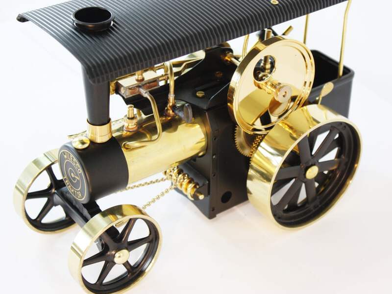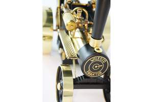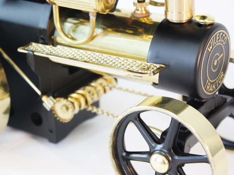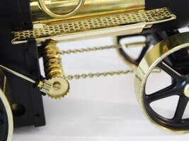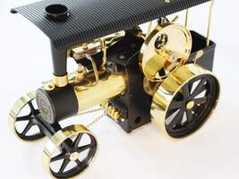 The tractor can move forward and backward, powered by a flywheel that can be started in either direction. The boiler has a diameter of 45mm and a length of 185mm and can hold 230 cubic centimeters. The brass boiler has been polished to a high shine and nickel-plated. The accompanying water level gauge is designed as a glass display, inviting you to take a close look at the steam engine's operation. The tractor has chain steering and a transmission clutch. The mobile steam engine can also be uséd as a stationary engine, thanks to the disengage able gear drive. The running time is about 15 minutes with a full load of our dry fuel, Witabs.